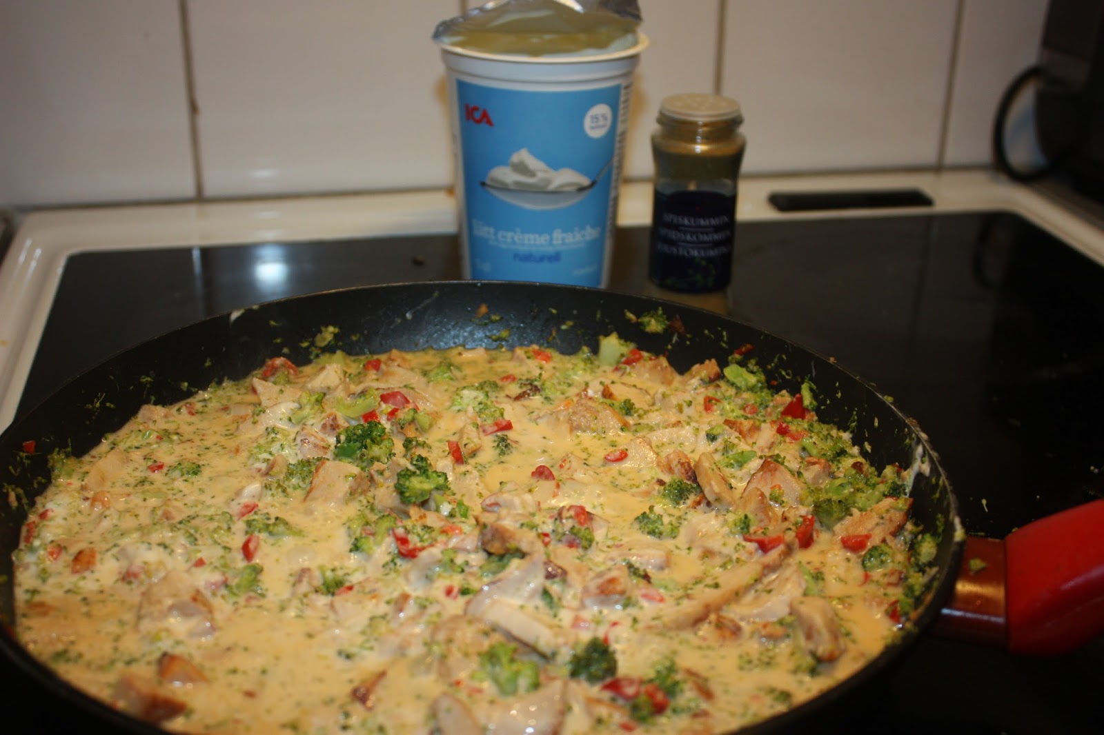 Igår provade vi Kronfågel Minutkyckling. Då ett paket räcker till två portioner så valde vi att blanda Minutkyckling Classic med Minutkyckling Bbq. Jag stekte kycklingen med hackad broccoli, paprika och chili och sen blandade jag i en stor burk creme fraiche , lite salt och massor med av Spiskummin!