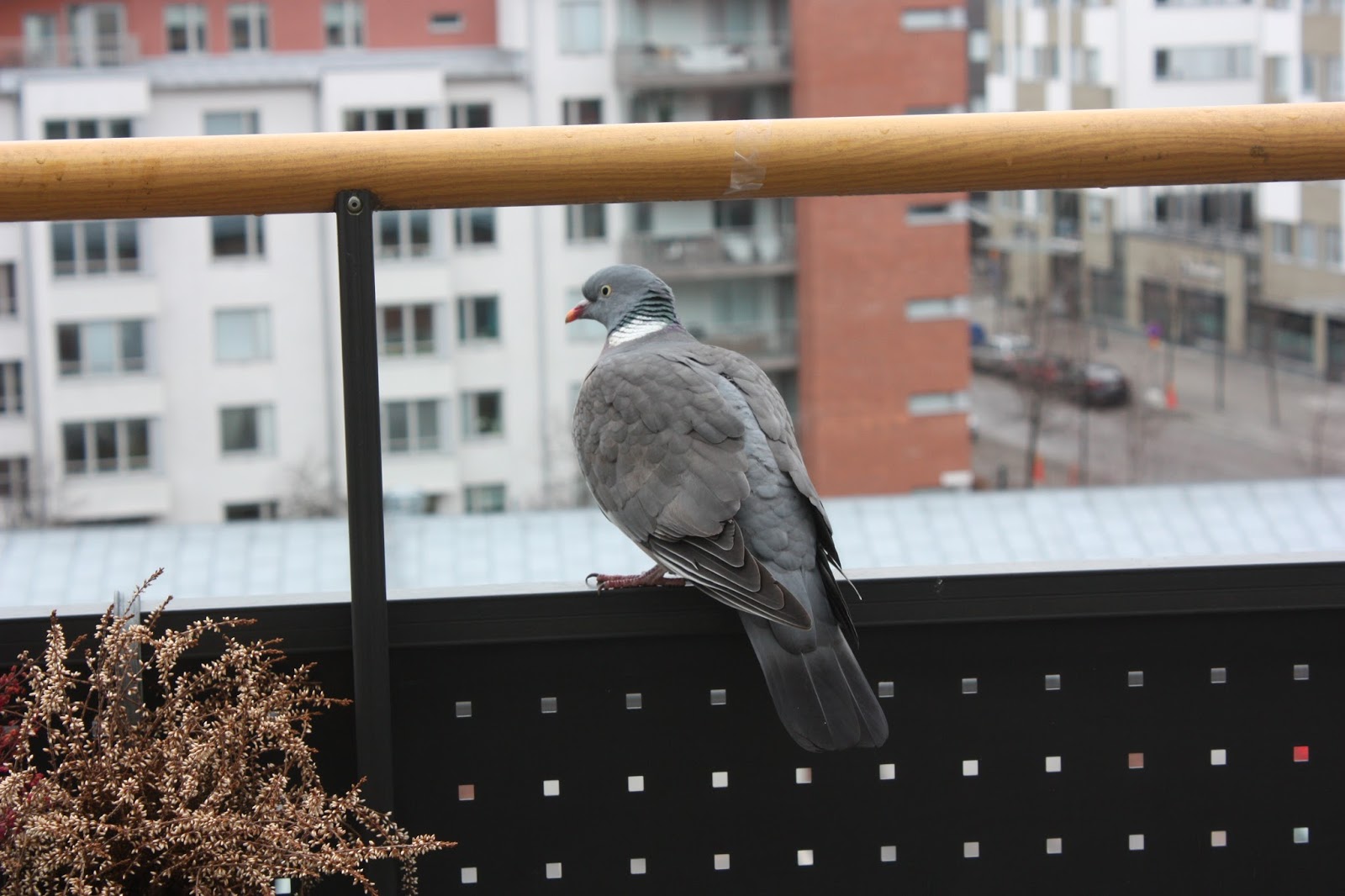 Just det, det sitter två duvor på vår balkong som tydligen har bestämt sig för att de vill bo där i mina gamla vissna blommor, de är inte alls rädda och jag tycker att de är fina men jag vill absolut inte ha en massa fågelskit där så jag måste försöka få dem att förstå att de inte kan bo där. Kanske de fattar om jag kastar de gamla blommorna? Vad tror ni?