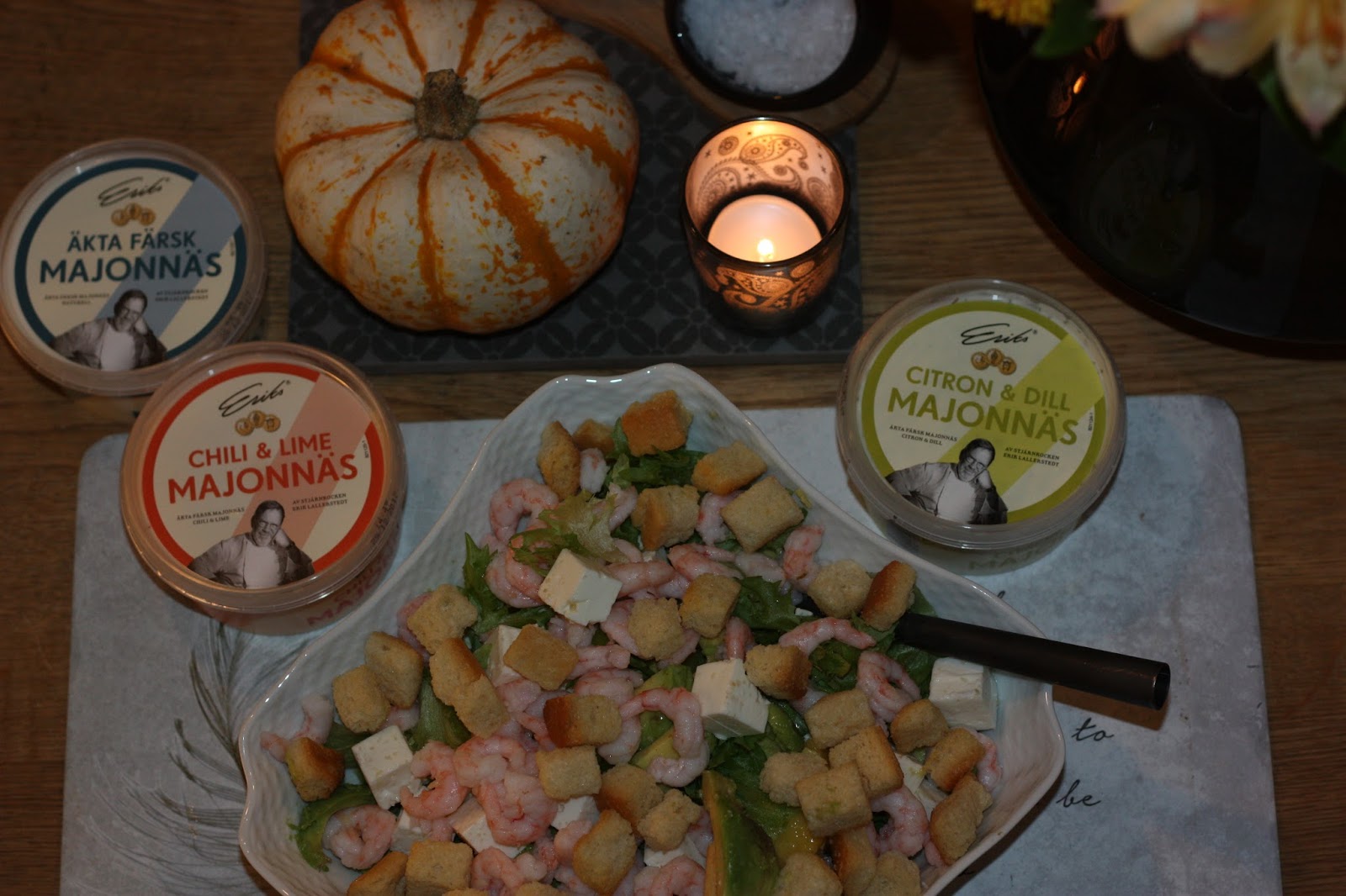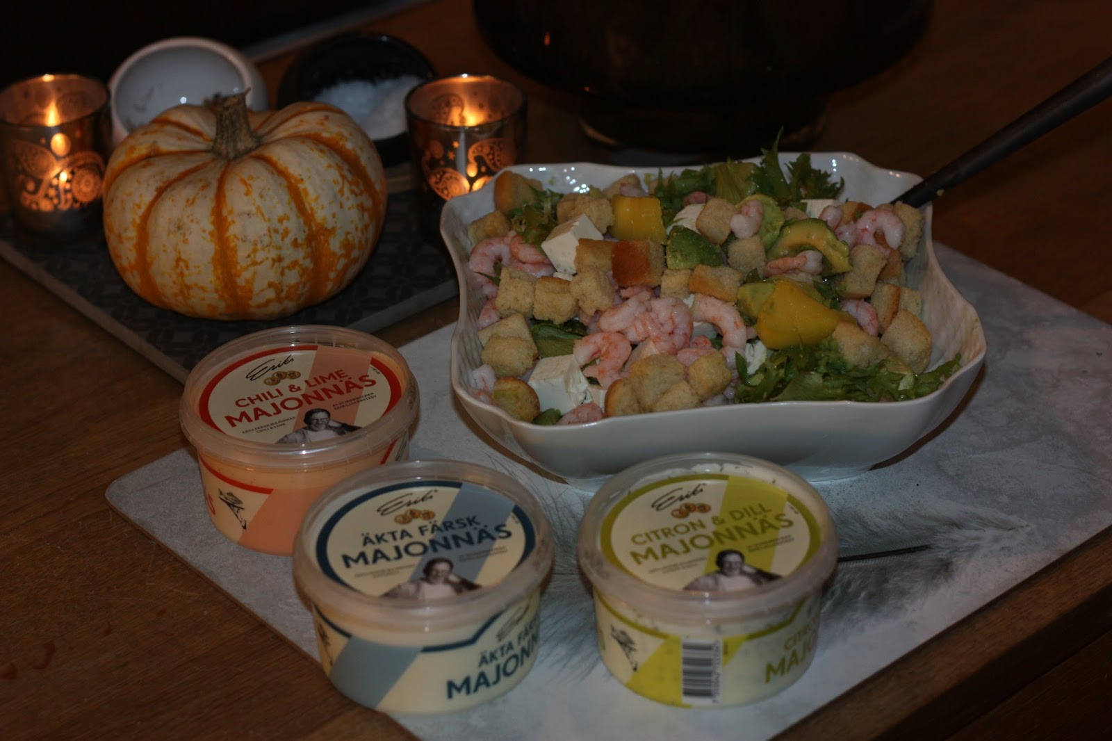 På räkmackan provade jag Eriks nya goda majonnäser, chili & lime och citron & dill som jag fått smaka genom Smakbox. I vanliga fall brukar jag bara ha neutral majonnäs men måste säga att det blev väldigt gott med dessa smaksatta. Jag har också provat att äta dessa majonnäser tillsammans med en räksallad och det blev också jätte gott! Räksalladen gjorde jag bara av lite grönsallad, mango, avokado, krutonger, fetaost och räkor. Så himla gott och så himla enkelt!