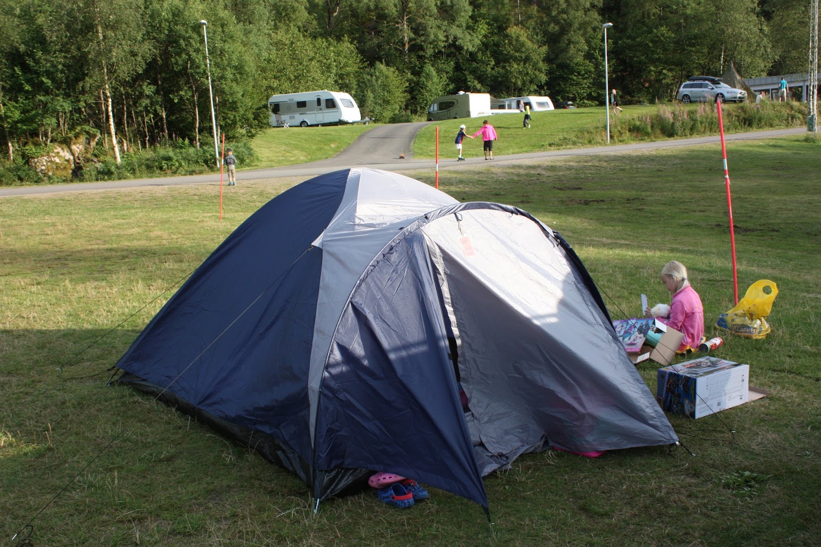 När vi planerade inför vår semester så hade vi ett familjemöte där vi diskuterade vad vi skulle göra. Barnen har i tre års tid tjatat om att campa och sova i tält, varje år har Jocke och jag lyckats avstyra det men i år gick vi med att sova en natt på en camping… hua! Så fort vi körde in på campingen så började ångesten komma krypande… vi är absolut inga campingmänniskor och jag har campat när jag var yngre men Jocke har aldrig sovit i tält i hela sitt liv! Som tur var så hade vi övat på att sätta upp tältet hemma så att vi inte skulle behöva stå och svära över det på plats så allt gick rätt smidigt men satan vad hårt det är att sova på marken på bara ett enkelt liggunderlag i en sovsäck! Vi var bergsäkra både Jocke och jag att vi skulle vakna med ryggskott men konstigt nog fick vi inte det men en sak har jag lärt mig att jag som i vanliga fall har svårt att sova vid fullmåne bör absolut inte tälta precis vid fullmåne som det typiskt nog var just denna natt! Dessutom drack jag kaffe klockan 21.00 på kvällen vilket kanske inte heller är så smart…. barnen tvärsomnade och även Jocke somnade rätt fort, han var livrädd över att frysa så han hade dragit ihop sin sovsäck så hårt så bara näsan stack ut, ha ha… han såg ut som en söt gurka i sin gröna sovsäck 😉