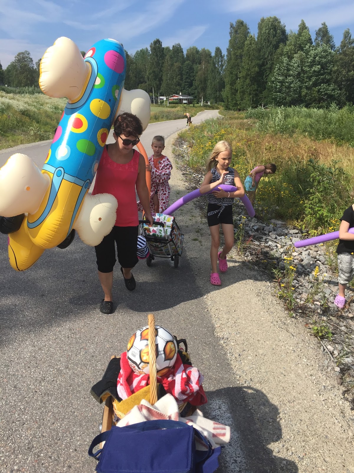 Nu har våra vänner Helena, Tilda och Linnea kommit och hälsat på oss. Vi har jätte mysigt och det blir mycket god mat och dryck och barnen leker jätte bra med varandra. Igår när de kom så gick vi nästan direkt ner till sjön och badade och även idag har vi badat och barnen älskar det verkligen! Men det blir mycket kånkande när de ska ha med alla de uppblåsbara djuren, simkorvar, bollar, fika, handdukar och filtar… tur att vi har nära 🙂