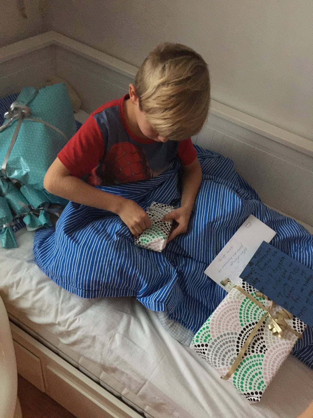 På lördagsmorgon väckte vi vår älskade Max med sång och presenter eftersom han fyllde 8 år!!! Helt otroligt att vår ”minsting”, vår gosiga och snälla kille redan är 8 år, nu känns det verkligen att småbarnsåren börjar försvinna helt. På ett vis saknar jag det men samtidigt så känns det lyxigt att få mer egentid igen och vi kan börja göra nya grejer tillsammans och barnen känns ibland mer som kompisar än ens barn vilket också är en rätt häftig upplevelse.