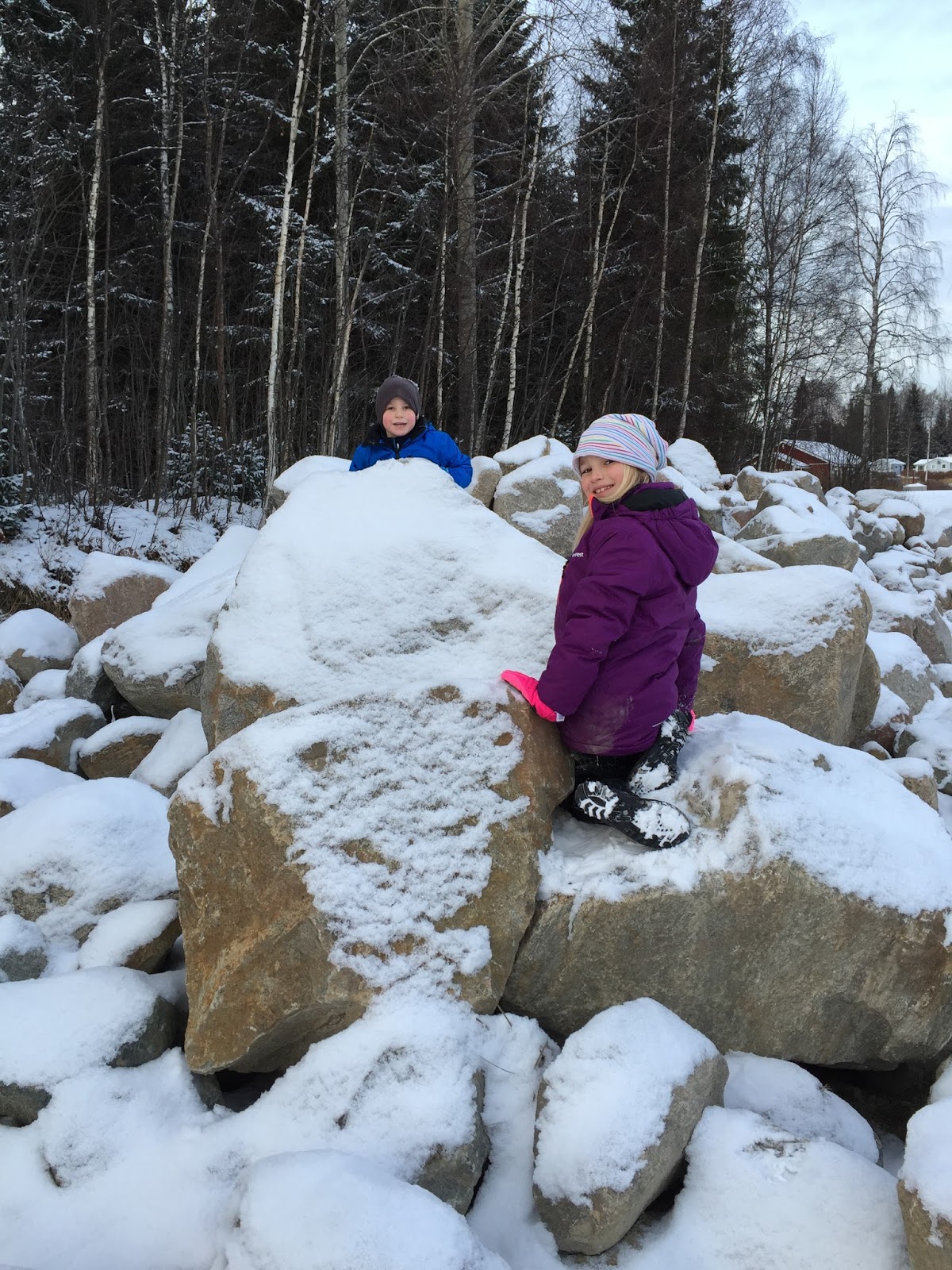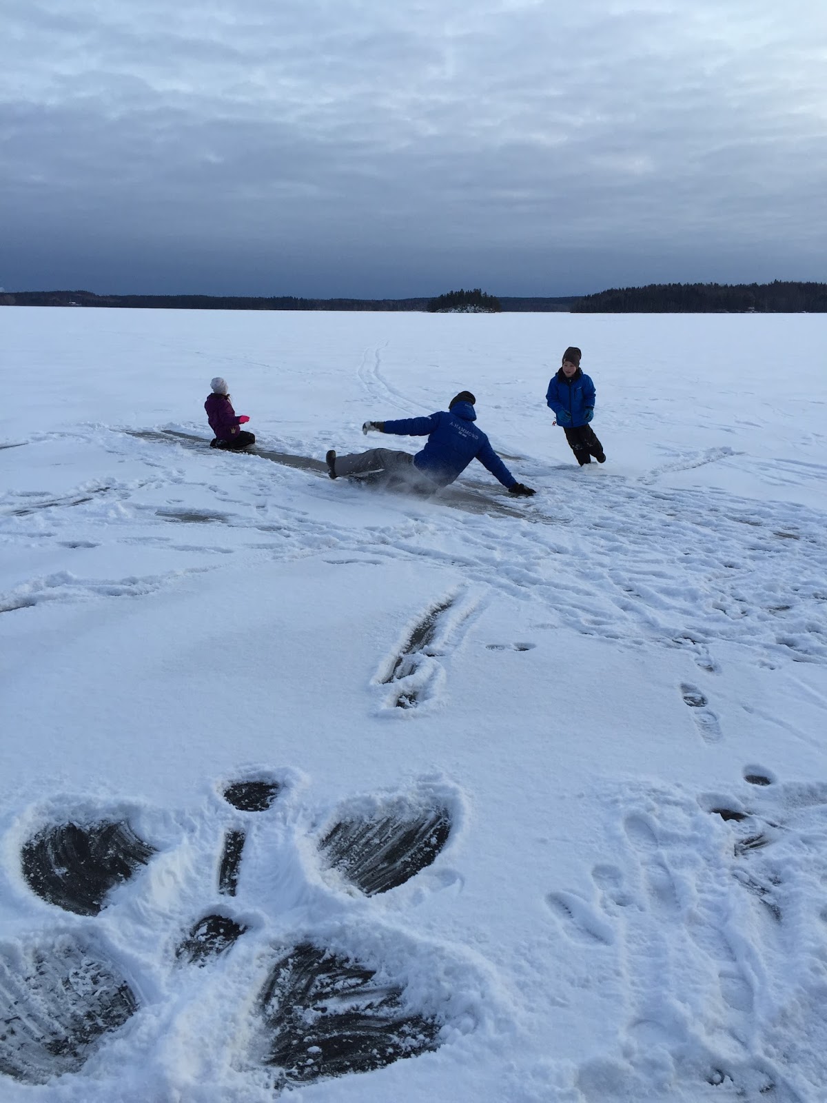 Här är det lika mycket/lite snö som i fjällen så idag har vi varit ute och lekt lite i snön. Vi har varit bort till stugan och kollat till den lite och passade då på att gå ut på isen. Det är tjock och härlig is med ett tunt lätt snötäcke så det hade varit en perfekt skridskois men tyvärr har vi inga skridskor med oss så det blev lite rumpåkning istället 😉