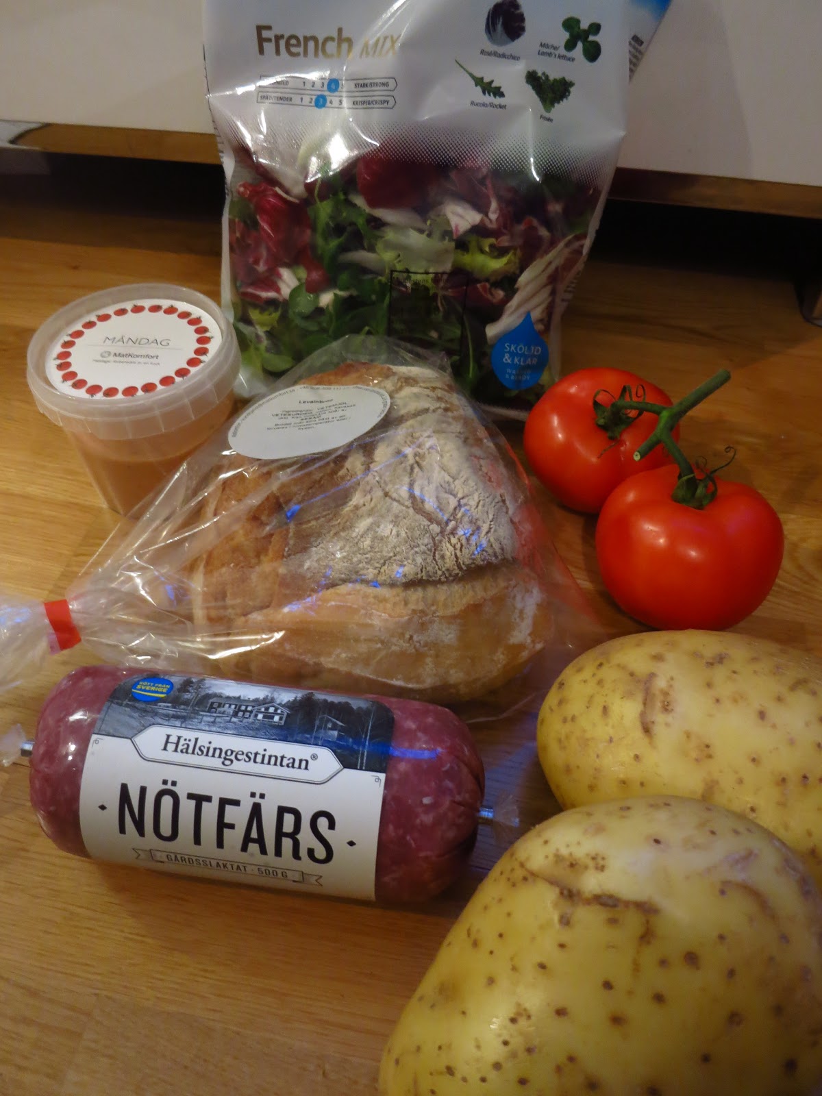 Nötfärs på rulle var ju himla smidigt, bara att skära i skivor, platta ut, krydda och steka! Brödet stekte vi i smör och till det gjorde vi rostad klyftpotatis från bakpotatisarna som följde med.