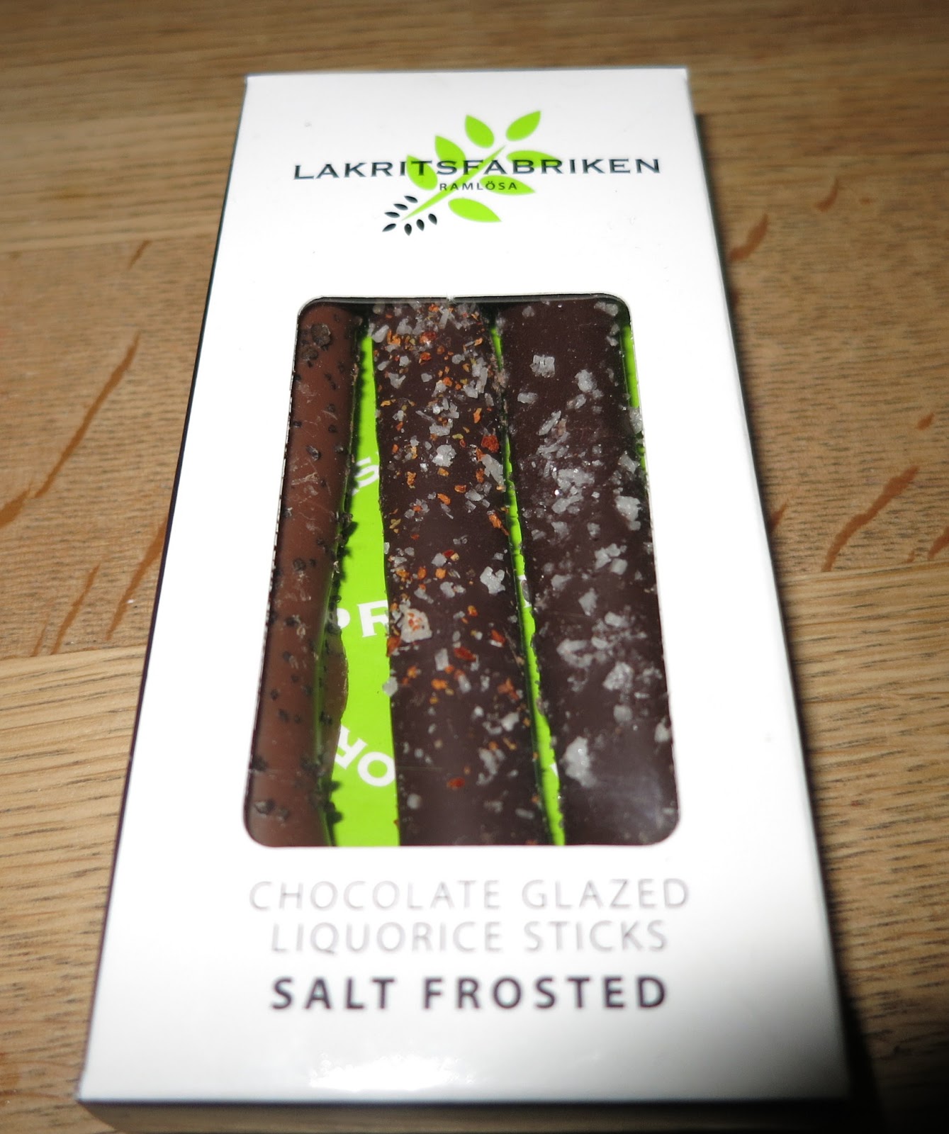 Lakritsfabriken Granule, Frosty & Chili flakes. Tre stycken salta lakritssticks doppade i choklad från Valrhona med havssalt, lakritsgranulat/salt och chili flakes. Kan man med fördel lägga på fikafatet, gott!