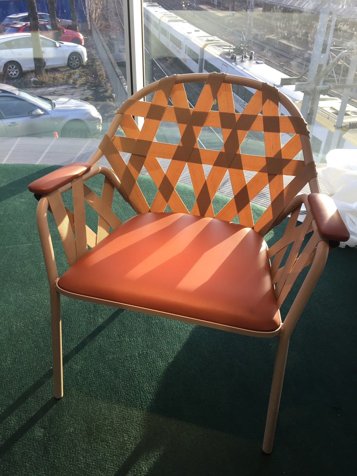 och nätt möbel i klassiska material som textilband och metall och möbeln