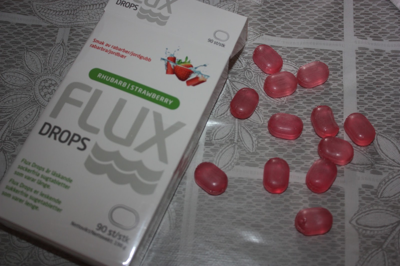 Flux Drops är läskande sockerfria sugtabletter som tas vid muntorrhet. Har en fräsch smak av rabarber och jordgubb. Flux Drops innehåller vinsyra och fluor som förebygger karies.