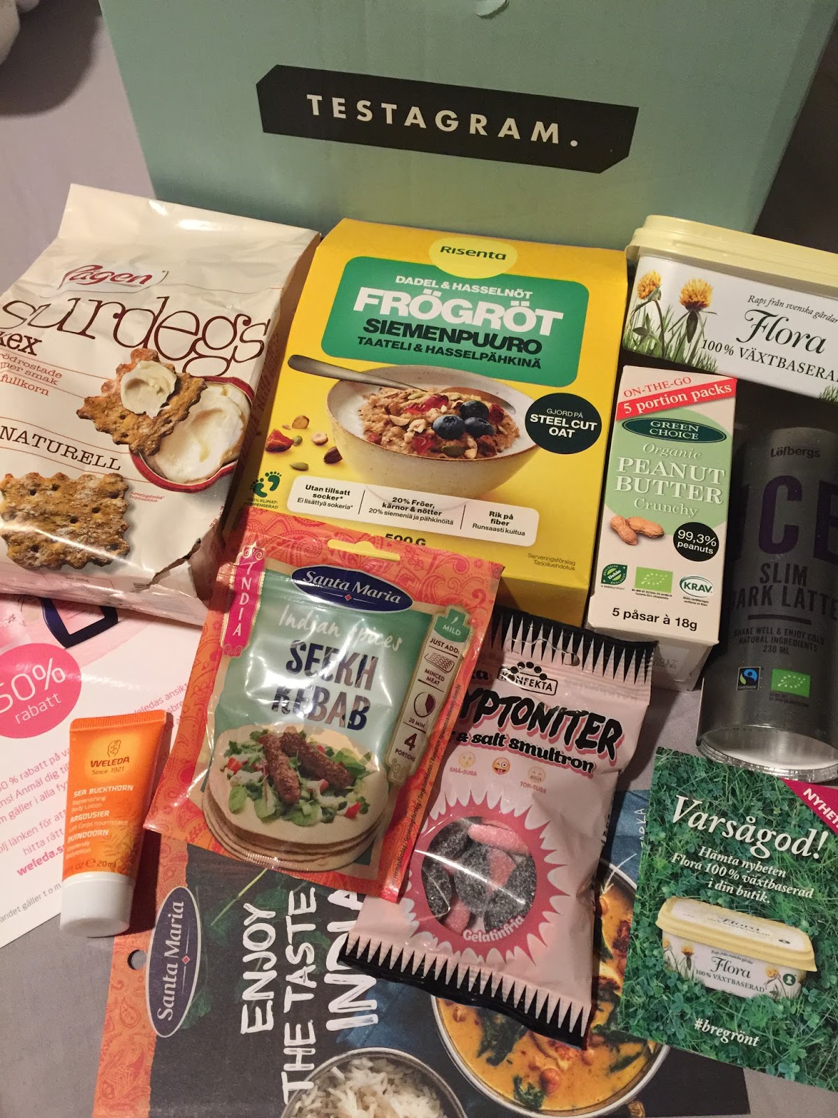 Jag hinner inte med mig riktigt när det gäller att blogga om de smarta boxarna från Testagram som kommer varje månad för jag vill ju hinna prova alla produkter innan jag skriver om dem. Detta resulterar den här gången med att det kommer recensioner av två boxar samtidigt! Förra månadens Testagram var fylld med många bra produkter och jag gillade mest Surdegskexen från Pågen och Kryptoniterna eftersom godis alltid går hem 😉