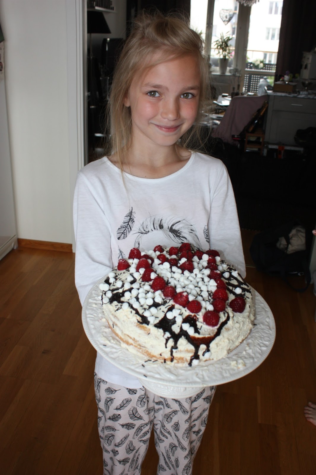 Barnen hade helt själva bakat en tårta med hallon, chokladsås och maränger och den var supergod!