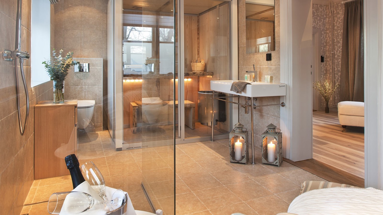 E-Type – Rustikt rum med dova färger, smakfull ljussättning och med ett stort runt badkar!