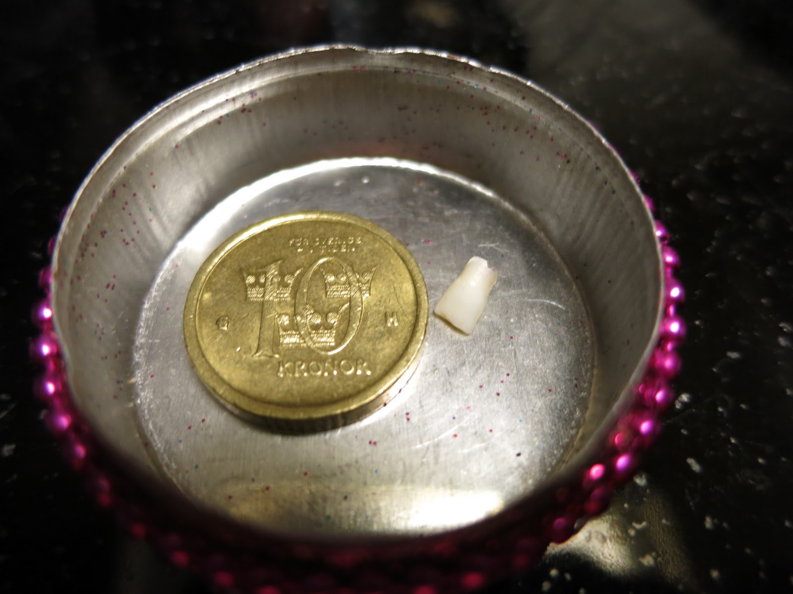Vi har fått nattbesök! För första gången så kom tand-fen till Smilla och bytte ut hennes första tappade tand mot en guldtia! Gissa om vi har haft en lycklig och stolt tjej här hemma 🙂