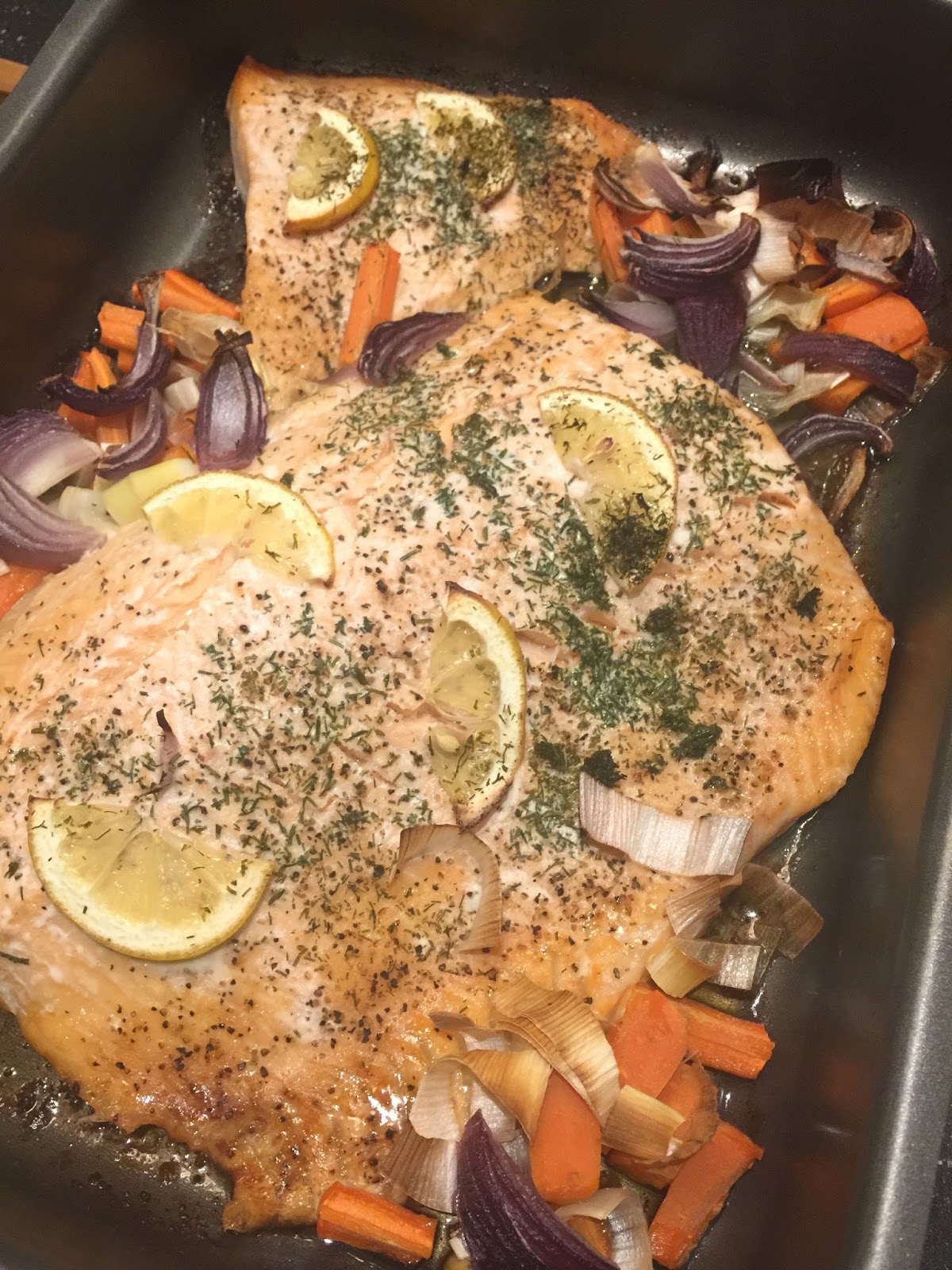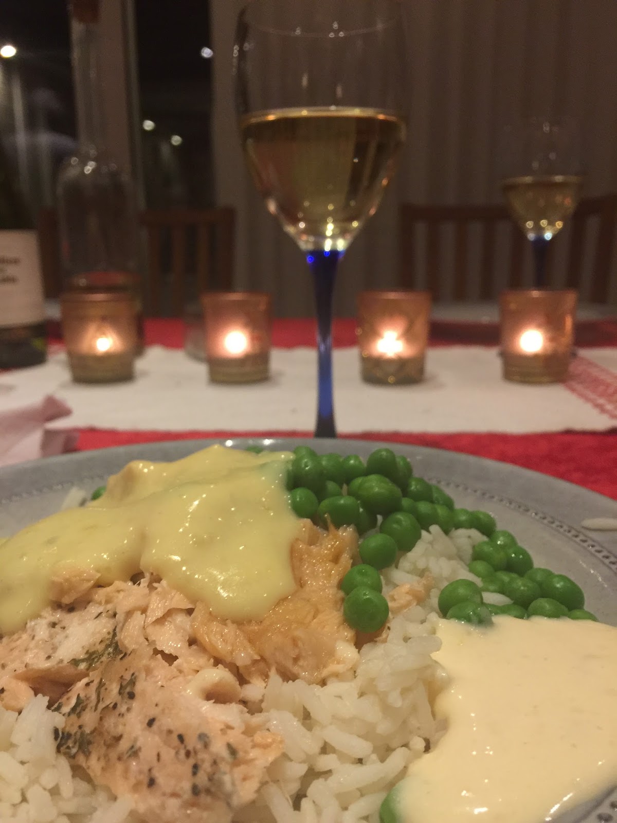 Till varmrätt åt vi en dag ugnsbakad lax med ris och goda såser. Bättre än att gå på restaurang!