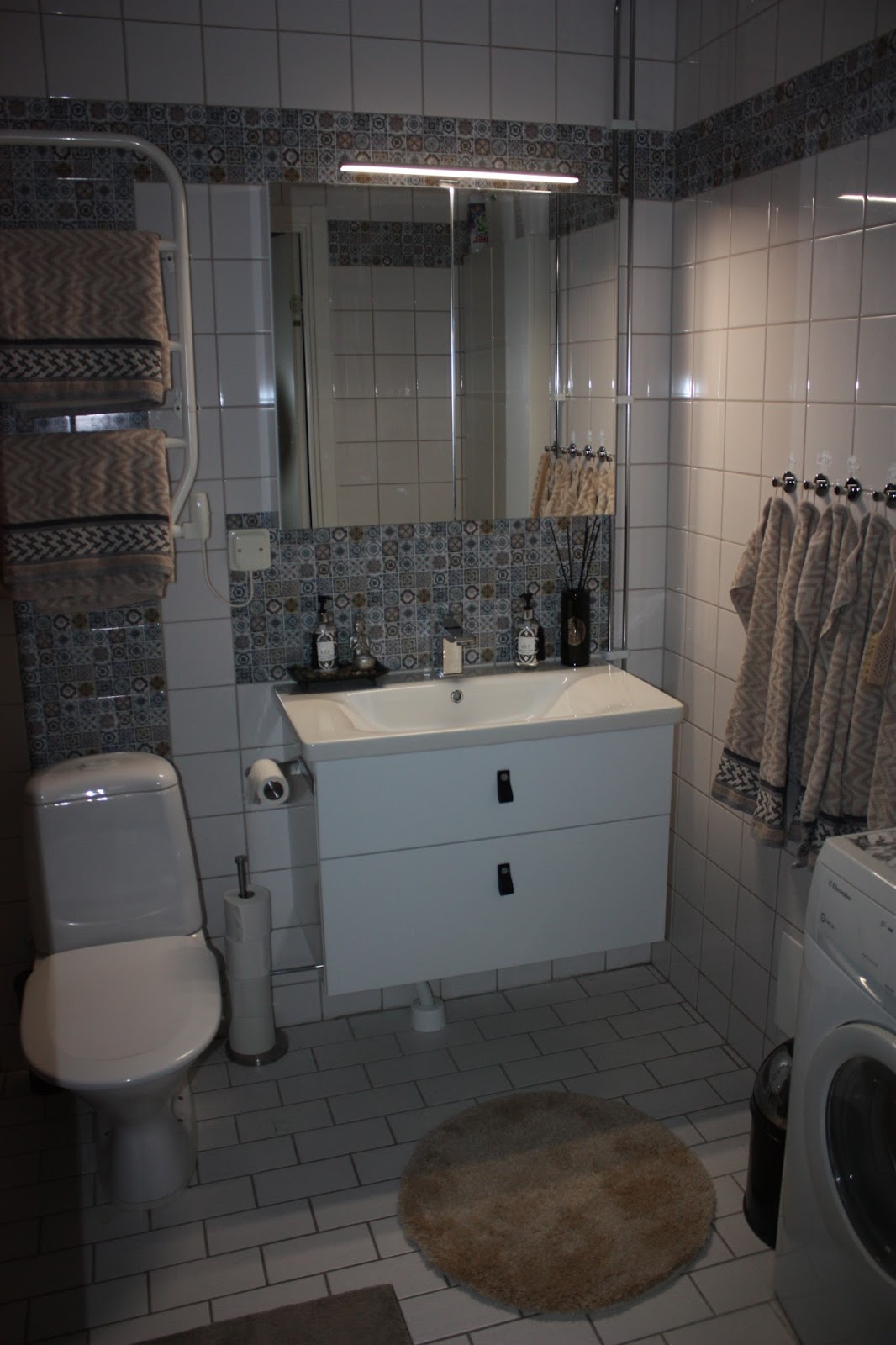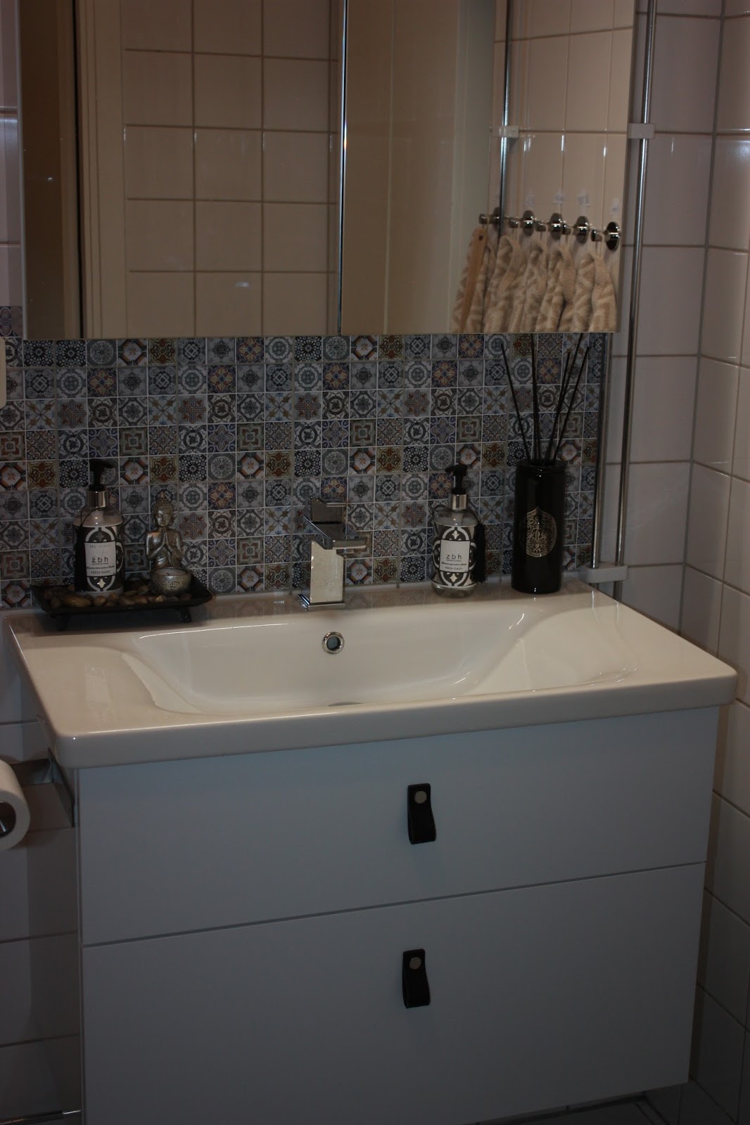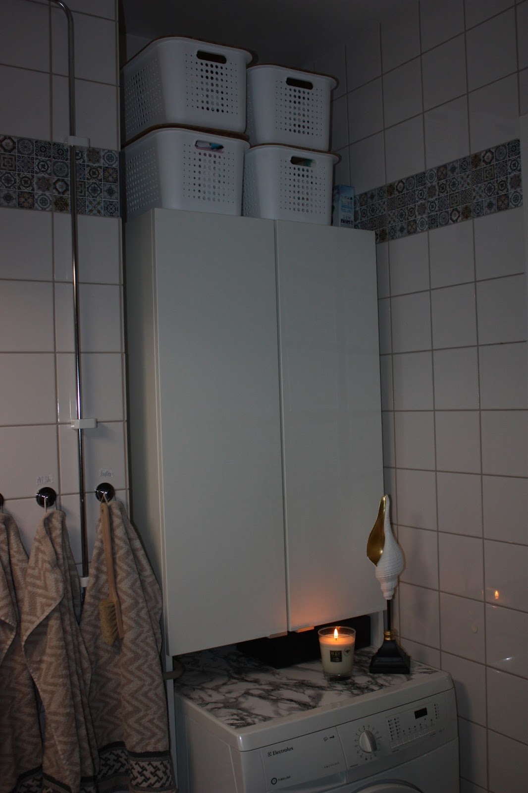 Lite skillnad, eller hur? Förutom att dölja den mörkblå kakelranden som gick runt hela rummet så satte jag även dekor ovanför tvättstället och bakom handdukstorken/toaletten och faktiskt så gav det en helt annan känsla i rummet! Eller vad tycker ni? De passar också jätte bra tillsammans med vår nya badrumsinredning från Vore.se.