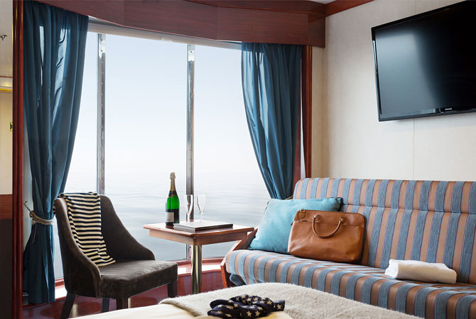 -Kosta på er en lyxig hytt… det är bra mycket trevligare att ha stora fönster och en dubbelsäng istället för trånga hytter med 2 våningssängar! Tror heller inte att det finns obligatorisk champagne i de små hytterna 😉