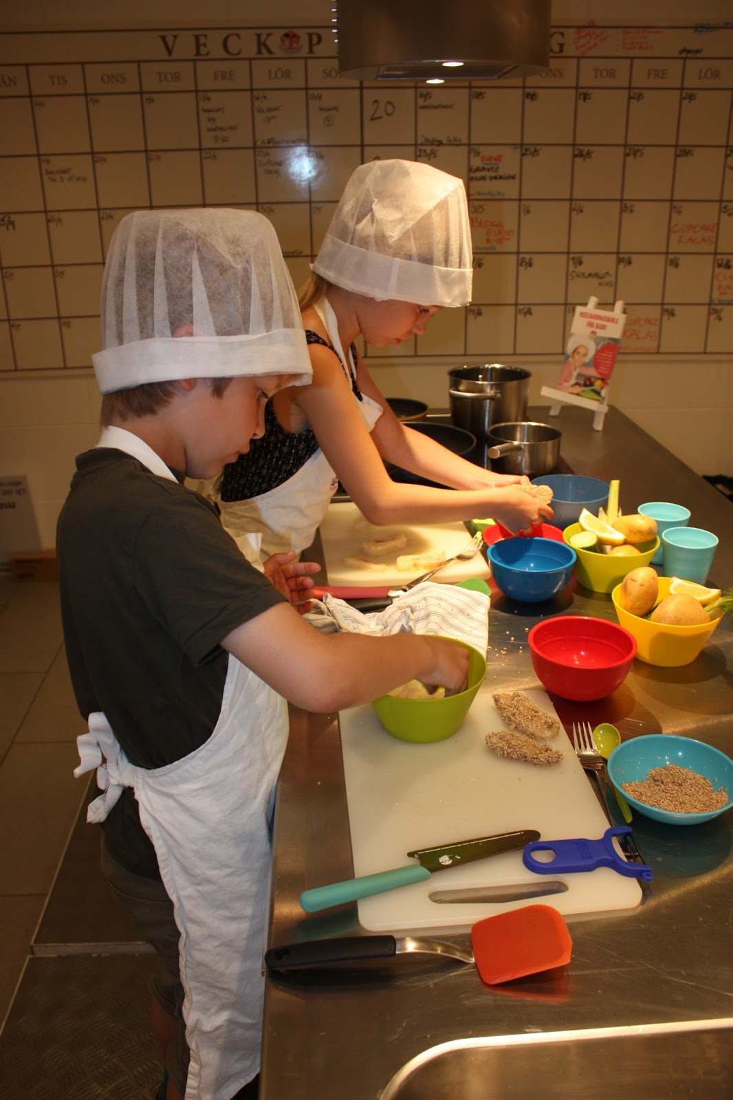 Madeleine som driver företaget gick runt bland bland barnen och gav dem tips och viss hjälp med spisen, jag som mamma hade bara uppdrag att fotografera. Sen var det en liten tävling som gick ut på att lägga upp maten snyggt på tallriken. Smilla satsade på att lägga ”matklockan” som de pratar om mycket i skolan just nu och Max drömde sig tillbaka till fjällen och la upp ett berg av mos och gjorde sen spännande skidbackar nerför i form av gröna och bruna pistar 🙂 Men tyvärr vann de inte för vi fick se många spännande uppläggningar och det var kul att se alla barnen kämpa och att se deras fantasi på hur mat kan läggas upp på olika kreativa sätt.