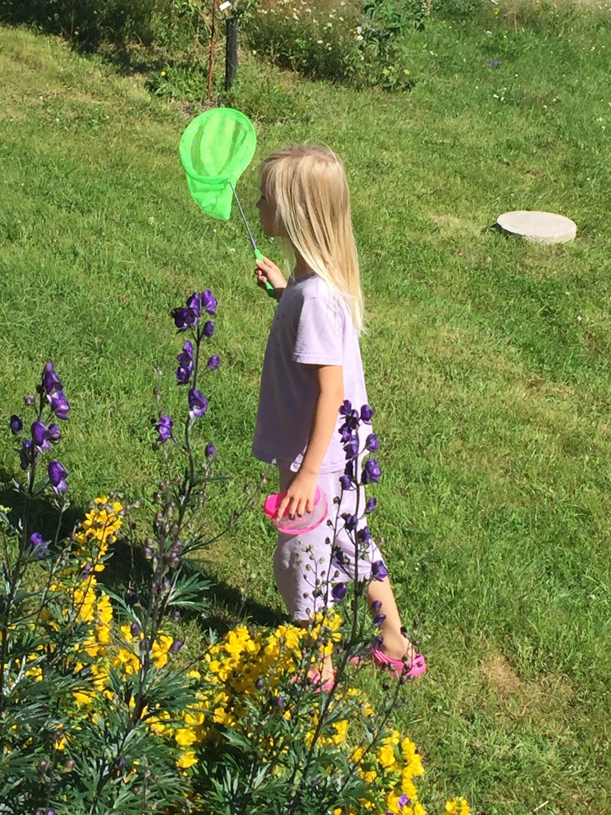 Idag har det inte varit ett moln på himlen och jag har suttit på altanen och bara sugit åt mig massa sol! Barnen sprang hela förmiddagen runt i pyjamasar ute på gräsmattan och försökte fånga fjärilar med håvar och Jocke har varit duktig och klippt gräset och slagit vass nere vid sjön. Med andra ord en helt perfekt sommardag!