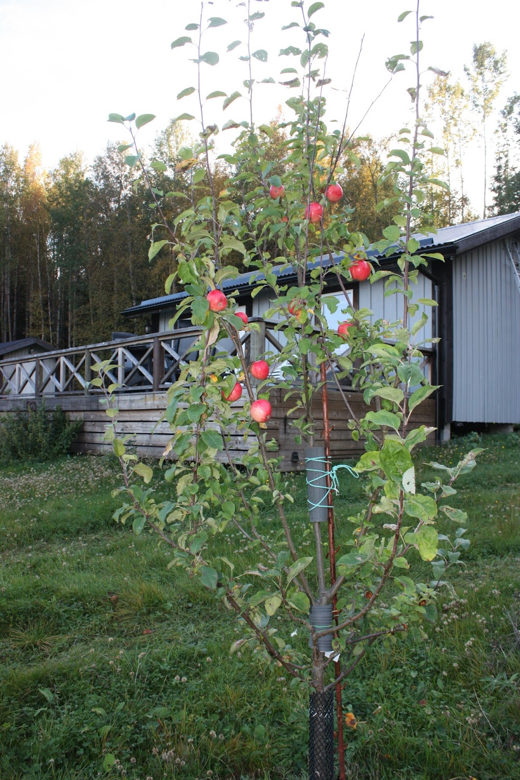 Möttes av vackra äpplen på vårt nya äppelträd! Så roligt med första skörden och det är något extra att få mumsa på egenodlade äpplen 🙂