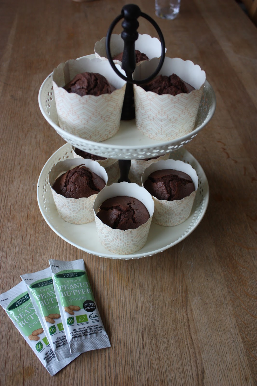 Jag fick hem Jordnötssmör från Green Choice med senaste Testagram och då jag inte är så förtjust i att äta jordnötssmör som det är så bestämde jag mig för att baka något med dem. Valet föll på Chokladmuffins med en touch av jordnötssmör.
