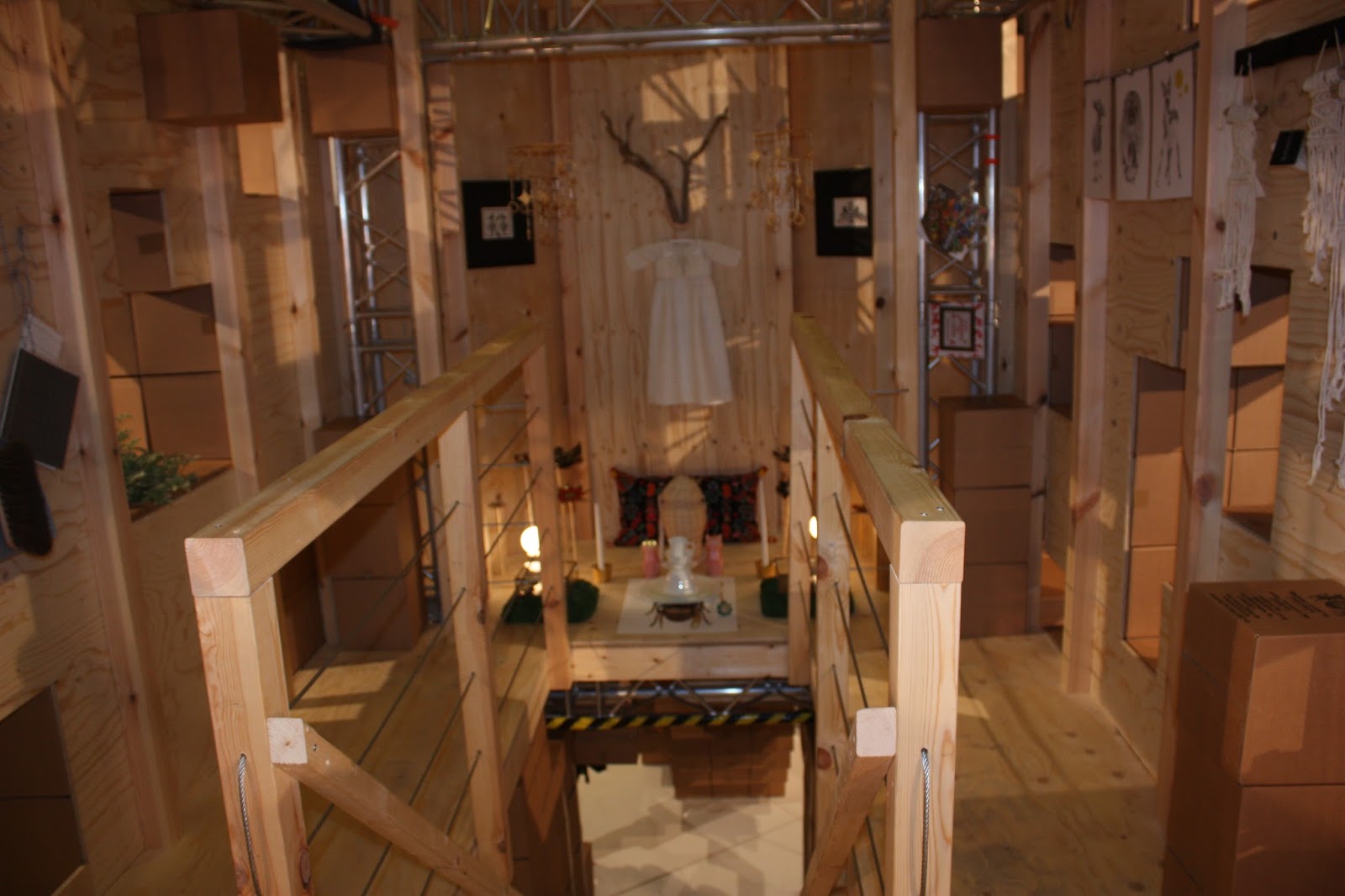 I foajén möttes man av denna huskatt som var byggd av kartonger: