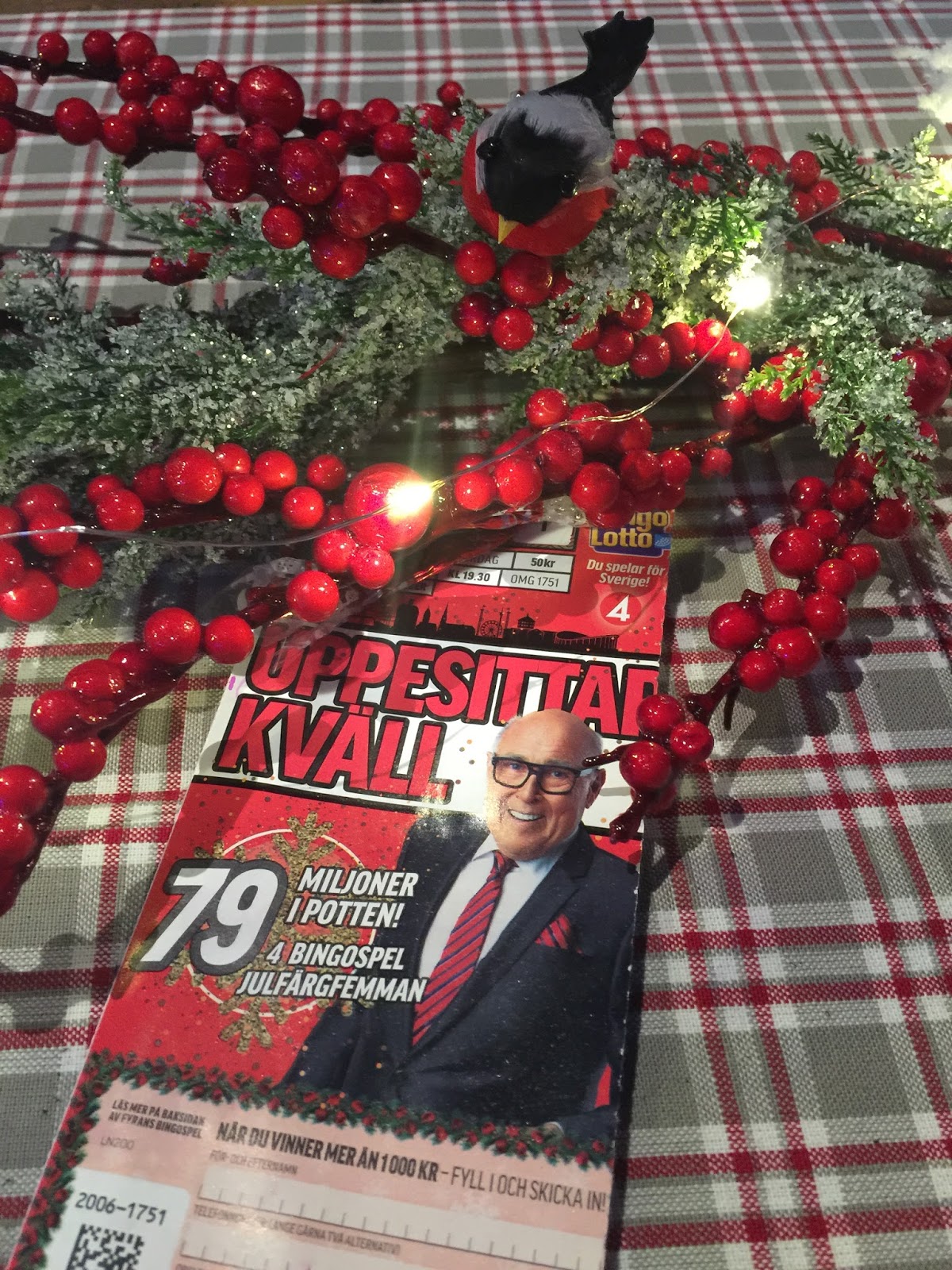 Det har varit en väldigt intensiv höst/vinter då Jocke har varit borta i stort sett sen i september och jag själv har också haft mycket jobb. Barnen har haft mycket med sina fritidsaktiviteter och de har haft enormt mycket läxor och prov! Tror att min hjärna verkligen har jobbat på högvarv med allt som inte fått glömmas och alla väskor som ska packas hit och dit. December månad blev ju kulmen med alla aktivitetsavslutningar, julavslutningar, det skulle bakas, köpas presenter och dessutom en säsongsavslutning med mitt inredningsteam. Enkäter skulle svaras på och redan nu ska det beställas och bokas inför nästa säsong så att man snabbt kan starta upp i mitten på januari när nästa kollektion kommer. Pust! Dessutom gjorde bilen sig påmind om att den behövde komma till verkstaden för lite behandling och ett dygn senare checkade vi ut henne för 9000 kr! Perfekt så här i juletid när man verkligen behöver alla pengar man har…. I onsdags var det ju julkonsert och vi kom i säng väldigt sent, på torsdag var det sista skoldagen och Smillas och min förkylning bröt ut med dunder och brak! Kvällen avslutades med TV-inspelning för Smilla och vi kom i säng väldigt sent då också. Fredagen bestod av att packa och försöka kurera oss och sen var det bara att hoppa in i bilen och köra mot Göteborg. Vi plockade upp Jocke efter vägen och anlände sen hotellet i Göteborg vid 01.00 på natten, bara att hoppa direkt i säng. Dagen efter var vi med i TV-inspelningen av Bingolotto och i 7 timmar satt vi där på helspänn och hade det rätt roligt. Det var intressant att se hur det går till och alla som jobbade med produktionen var så enormt trevliga och vi blev mycket väl omhändertagna. Trevligt också att mingla runt med programledarna, artisterna och bandet men vi vann tyvärr ingenting på våra lotter. Men vi var med tydligen en hel del i TV:n har jag hört, Jocke syntes såklart bäst på scenen men det blev rätt mycket glimtar på oss i publiken med. Vi var tillbaka på hotellet vid kl. 02.00 och ställde klockan på 8.00 då vi inte ville sova bort julafton. Det blev packning och hotellfrukost innan vi hoppade in i bilen och körde i 3 timmar mot Skåne och Jockes familj där vi skulle fira julafton.