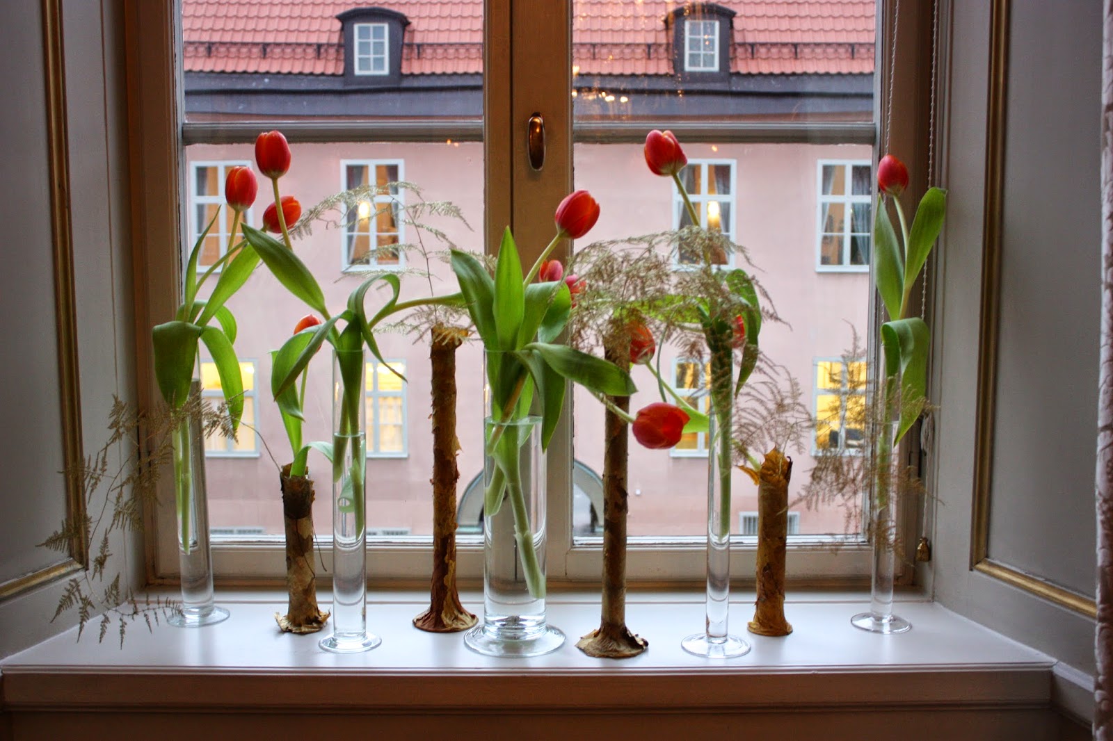 Tänkte avsluta med en vacker bild på hur man enkelt kan skapa ett vackert fönster med hjälp av några tulpaner och höga smala vaser. Visst är det snyggt?