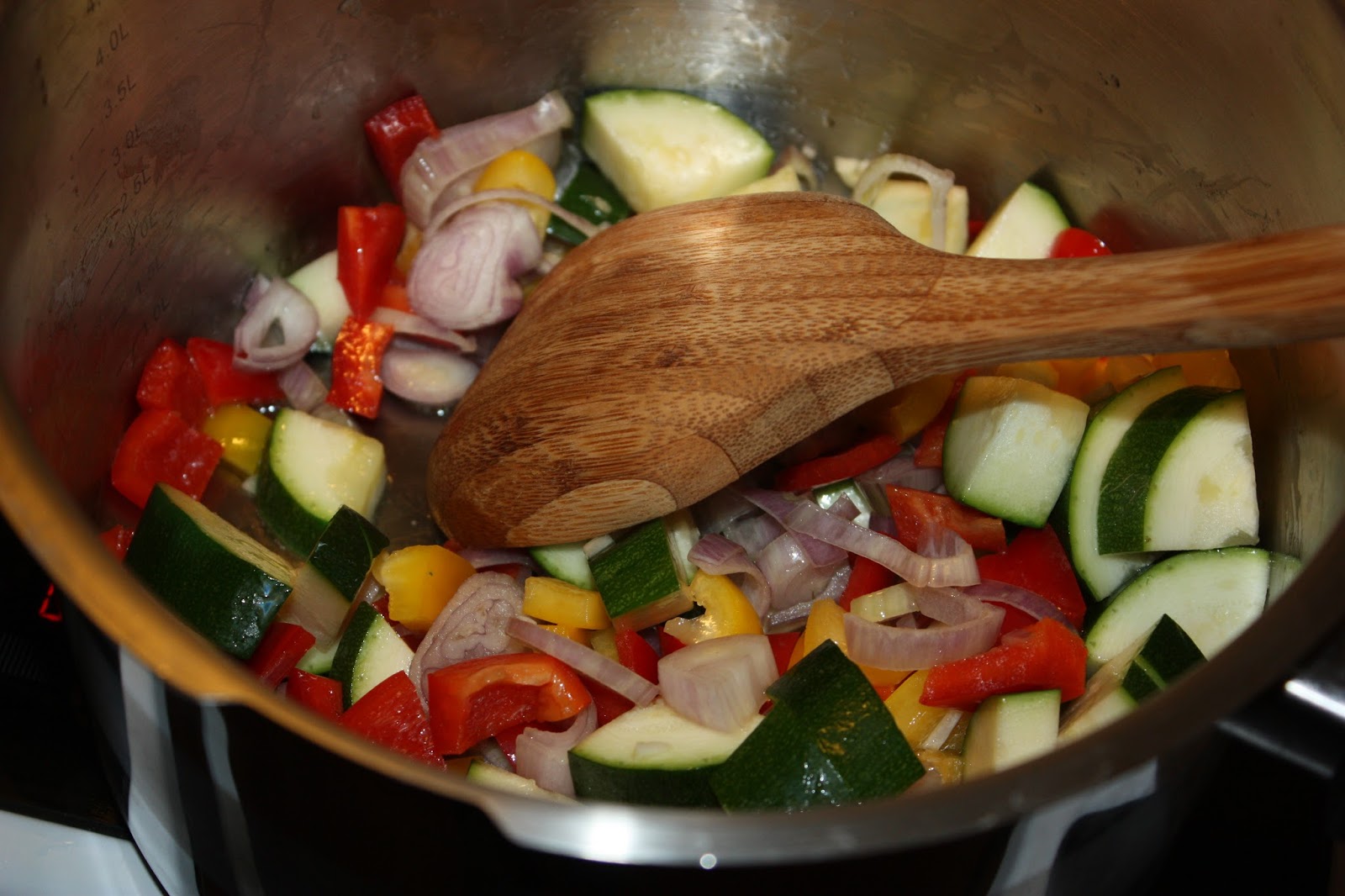 Värm en vid kastrull. Fräs zucchini, paprika, schalottenlökar och