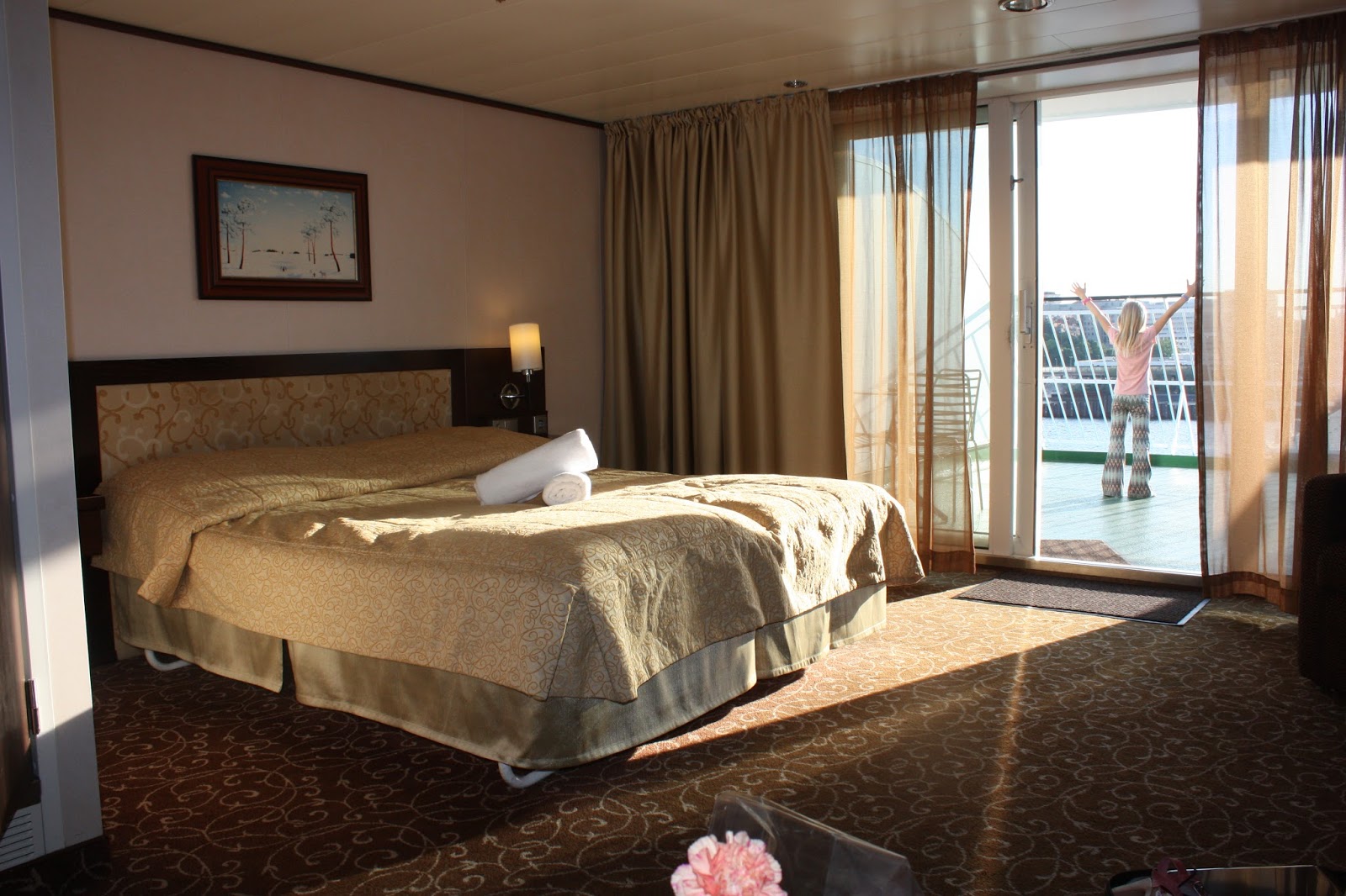 Jag har ju glömt att skriva om vår kryssning med Silja Galaxy då vi hade 23 fantastiska timmar ute på Östersjön. Vi åkte hela familjen och som jag nämnt förut så finns det kryssningar och sen så finns det lyxkryssningar! Bokar man en ”vanlig” hytt på en kryssningsbåt så får man ofta en liten hytt med två våningssängar och ett litet runt fönster. Vi fick den här gången värsta sviten med dubbelsäng, bäddsoffa, fri minibar, fri champagne, frukt, godis och egen balkong! I dessa sviter ingår dessutom champagnefrukost!