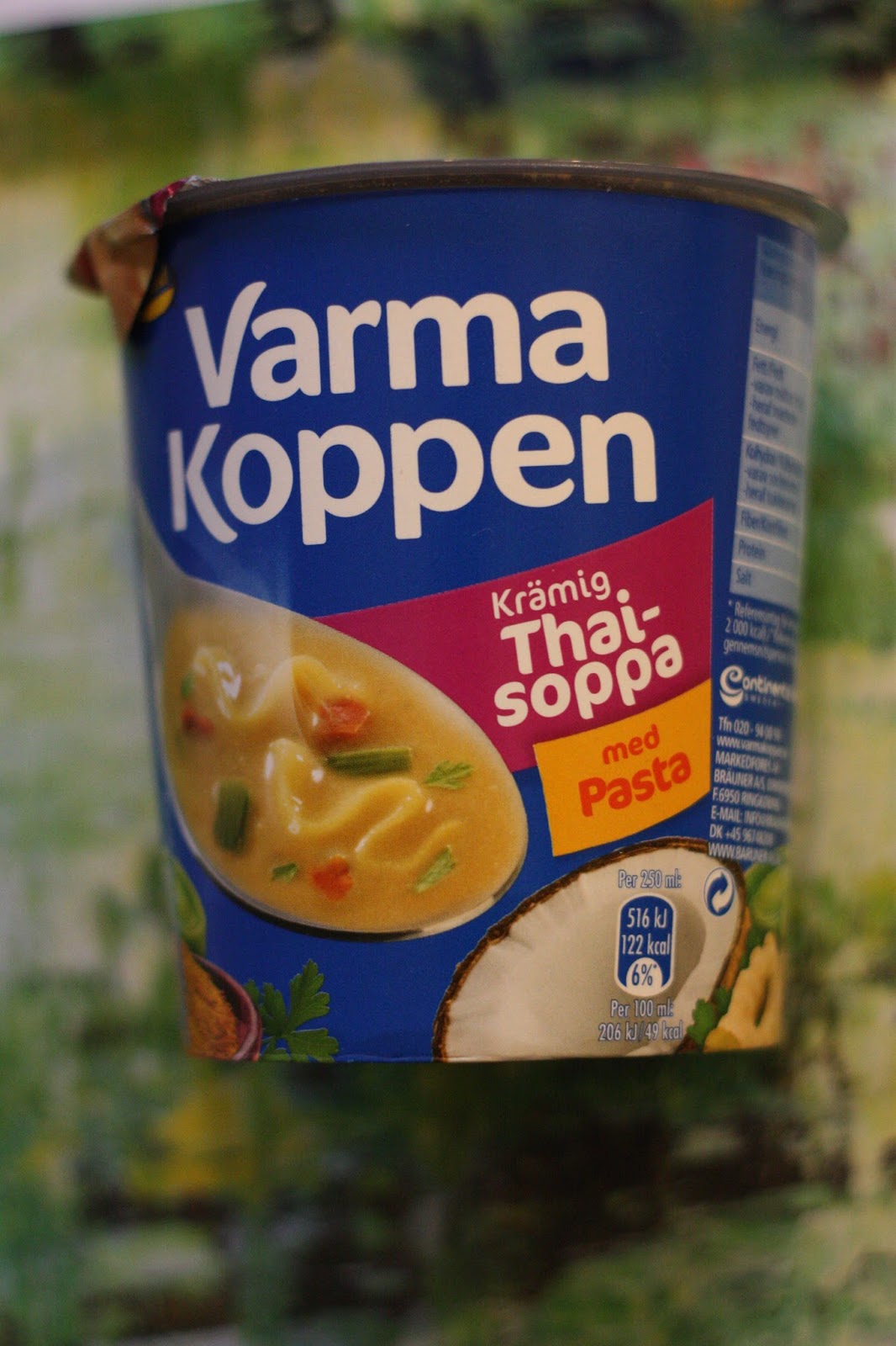 Varma koppen krämig Thaisoppa med pasta som kan värmas och ätas direkt ur förpackningen. Denna har en smak av ingefära, chili och vitlök och smakade helt ok.