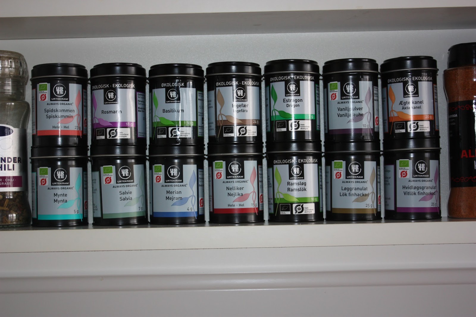 Igår söndag passade jag även på att städa våra kryddhyllor ovanför spisen. Mitt mål är att byta ut alla kryddor mot ekologiska och jag har kommit en bit på vägen. Gillar Urtekrams ekologiska kryddor och har nu även deras senaste nyheter; mynta, mejram, hel nejlika, hel spiskummin, torkad hackad lök, torkad hackad vitlök och salvia. Deras kryddor är odlade utan bekämpningsmedel eller konstgödsel och utan stress för plantan och därför blir smaken och aromen mer intensiv vilket man absolut känner i matlagningen tycker jag!