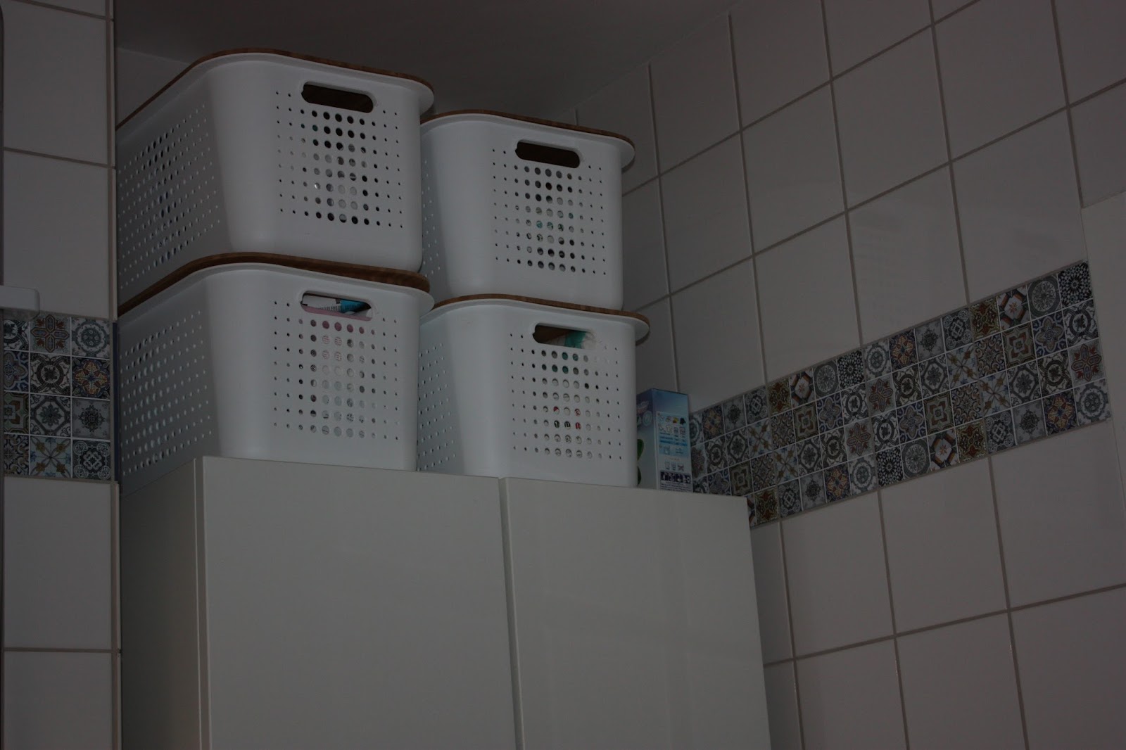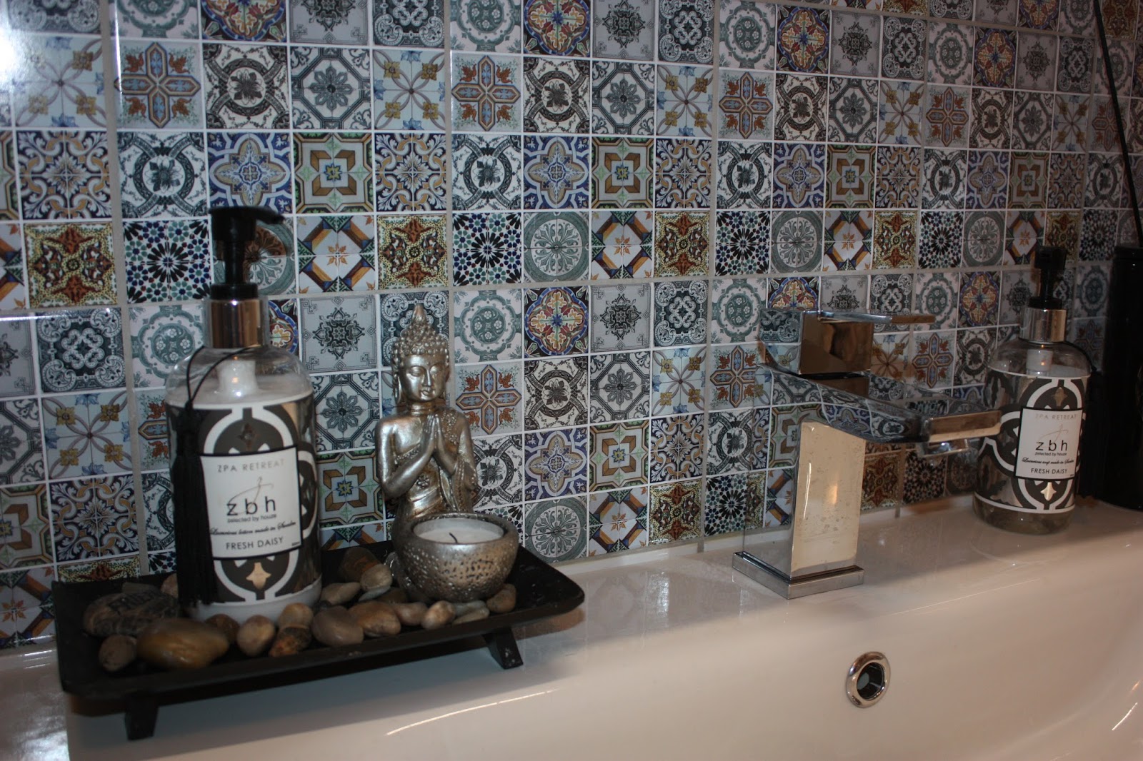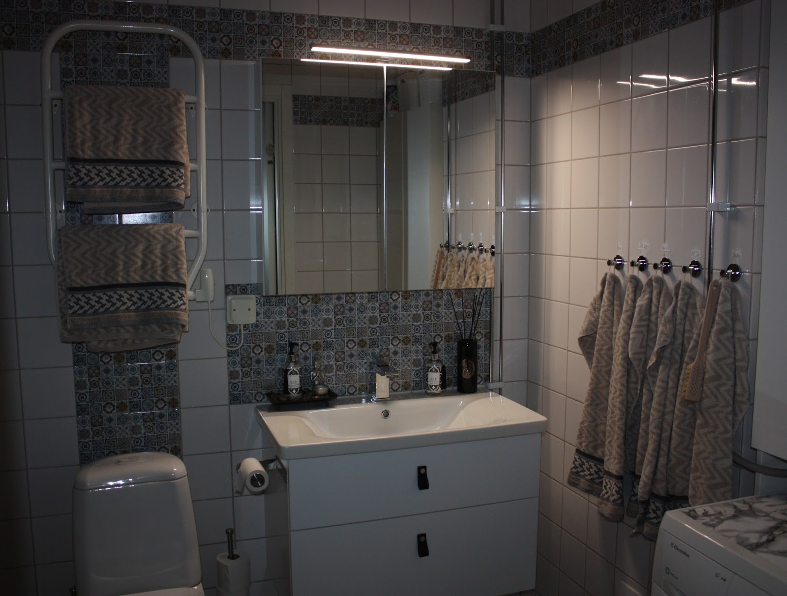 Lite skillnad, eller hur? Förutom att dölja den mörkblå kakelranden som gick runt hela rummet så satte jag även dekor ovanför tvättstället och bakom handdukstorken/toaletten och faktiskt så gav det en helt annan känsla i rummet! Eller vad tycker ni? De passar också jätte bra tillsammans med vår nya badrumsinredning från Vore.se.