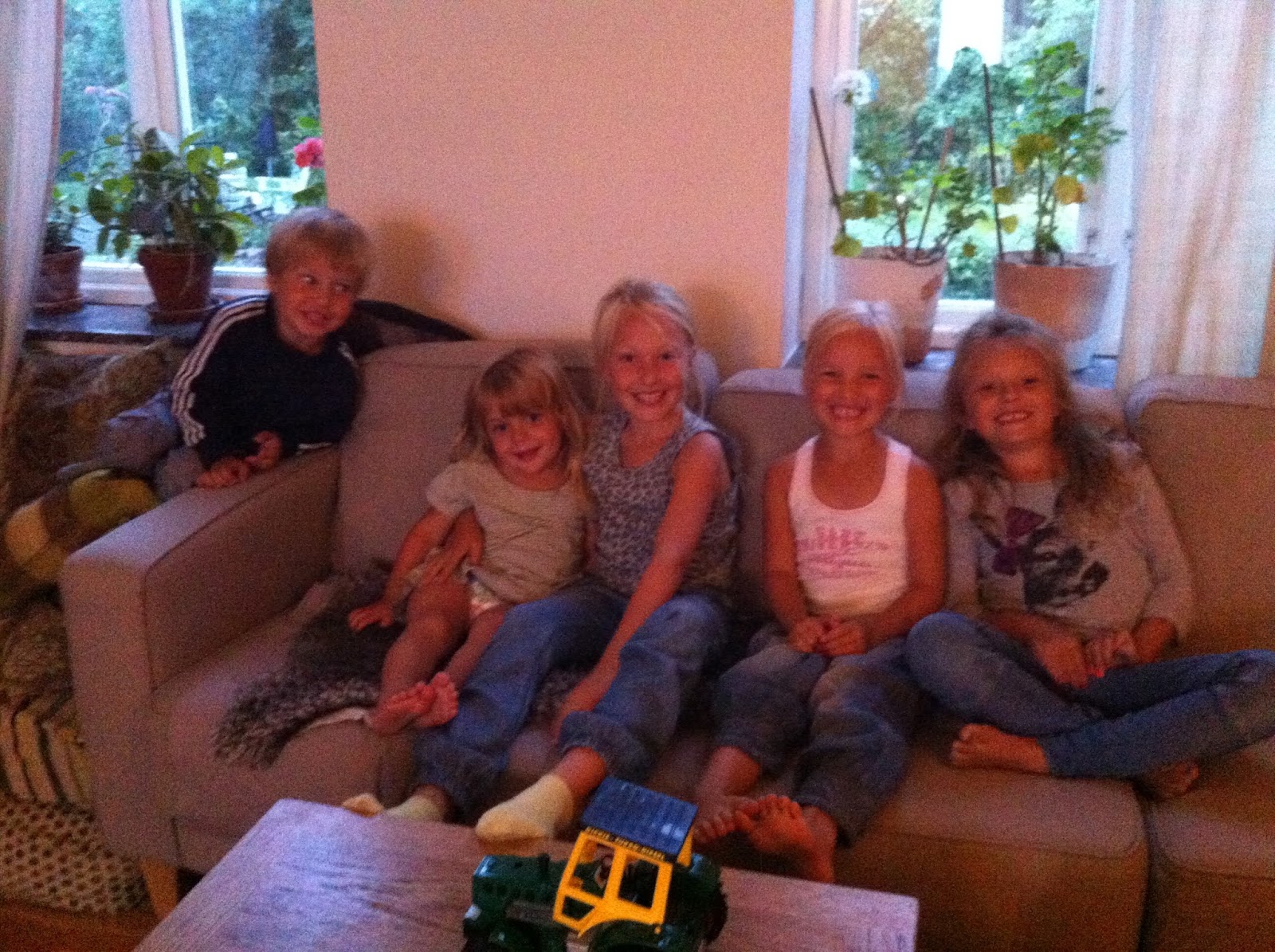När man är här nere i Skåne så går dagarna så fort! Man vill hinna umgås med alla i släkten och alla kompisarna men samtidigt vill man bara ta det lugnt och njuta av att vara ledig. Ikväll åkte vi hem till våra vänner, familjen Thagg i Anderslöv där vi blev bjudna på god mat och trevligt umgänge! Här ser ni hela kvällens barnaskara:
