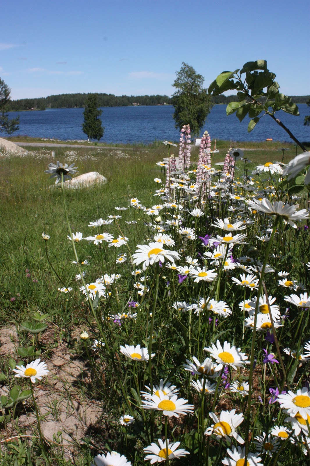 Jag älskar den här tiden på sommaren då så många vackra blommor blommar, det är verkligen sommar då barnen kommer in med fina buketter som de plockat. Hela ängar lyser färggrant av lupiner som jag vet är förrädiska mot naturen men jag tycker ändå att de är så vackra. Att lära barnen ”tupp eller höna” genom att dra vissa ”grässtrån” uppåt mellan fingrarna, att plocka blad från prästkragar och säga ”älskar, älskar inte”…. många barndomsminnen återuppstår när man får egna barn!